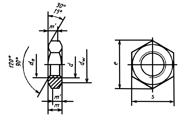 Конструкция и размеры гаек должны соответствовать указанным на рисунке 1 и в таблице 1.